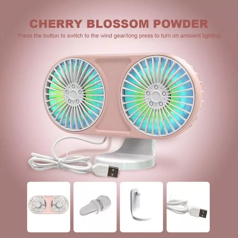 360° Rotating Dual-Head USB Car Fan with Ambient Lighting